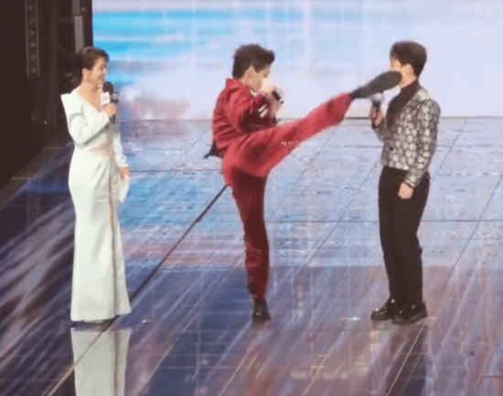 昨晚,向佐参加微短剧品质盛典,在台上展示功夫,主持人百克力夸他“穿丝绒西装把拳打得这么好”,他突然向百克力来了个飞踢,差点踢到他的头。